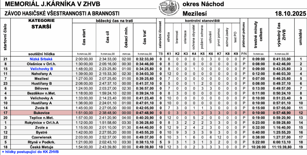 V sobotu 18. 10. 2025 se naše obě družstva (mladší a starší) zúčastnila okresního kola v závodu hasičské všestrannosti a brannosti v Mezilesí.